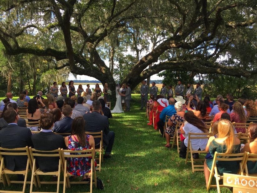 Runnymede Plantation has really burst onto the Charleston wedding venue scene in the past 2 -3 years. Located right off Highwat 61 after Middleton Place, but before Magnolia Plantation, it is quickly becoming a premier wedding venue because of it's views and locations for wedding ceremonies. Shhh. I actually saw a walking trail off the dirt road heading back into the plantation that leads over to Magnolia, but don't tell Magnolia that. The way I see it is it's a trail that is connecting two of the area's beautiful areas. One of Christina's friends was a violinist and provided most of the cermeony pieces after prelude music provided by myself. As the ceremony ended, we continued with a traditional approach to the ceremony music by playing the Wedding March followed by Vivaldi's "Spring" as guests were congregating around to get a group photo.