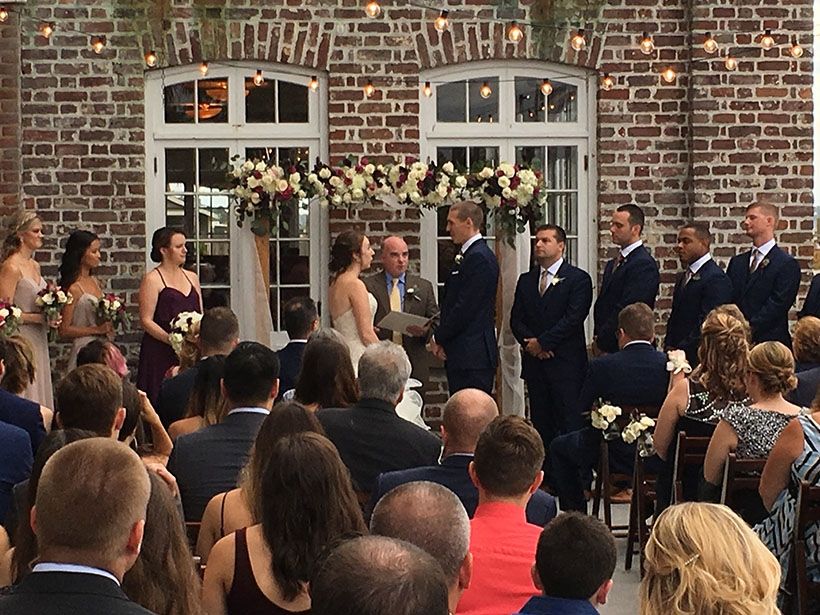 There is no doubt about it. Charleston remains a stronghold at the number 2 spot in the country for destination weddings. Maybe it was because a bride and groom met each other here at the College Of Charleston and wanted to come back and experience it's rich history, beautiful beaches, and excellent menu of fine restaurants. Maybe a bride used to travel here as a young girl with her family and remembered just how beautiful the city was and wanted to get married here? Whatever the reason, brides and grooms from all over the United States continue to flock to Charleston for it's romantic scenery and history. Kara & Ian were one of those couples who chose to get married down here in Charleston. They found Mike Bills Entertainment back in the early summer of 2016 shortly after getting engaged. They were married on Sunday, October 8, 2017 at the Historic Rice Mill. They currently reside in the greater Washington DC area and had guests coming down from the DC area, New York, and all over different parts of the country. For early October (even in Charleston), the weather was really very warm and humid with a heat index of 97. It felt more like August, but after a lovely ceremony with those harbor breezes that provide refreshing breezes to wedding guests, we quickly inside for a great cocktial hour, dinner, and an amazing night of dancing, fun, and memories.